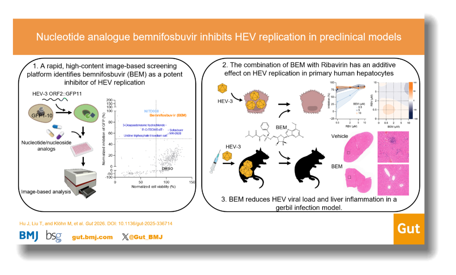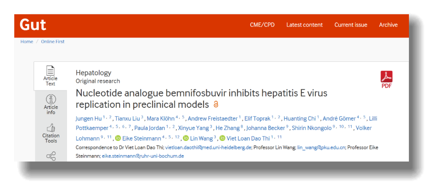 近日,基础医学院病原生物学系王麟课题组与德国海德堡大学Viet Loan Dao Thi博士团队、德国波鸿鲁尔大学Eike Steinmann教授团队合作,在消化肝病领域学术期刊Gut(IF="26.2)上发表了题为“Nucleotide analogue bemnifosbuvir inhibits hepatitis E virus replication in preclinical models”的研究成果。该研究首先建立了一种全长HEV报告病毒高通量筛选平台,进而发现核苷类似物Bemnifosbuvir(BEM)在HEV感染的多种临床前模型中具有显著的抗病毒效果。BEM是一种靶向病毒RNA依赖的RNA聚合酶(RdRp)的核苷类似物前药,此前已在针对丙型肝炎病毒(HCV)和新型冠状病毒等其他RNA病毒的研究中展现出良好的安全性及抗病毒活性。本研究通过建立高效的药物筛选平台,和多种体外及体内感染模型证实了其对HEV的抑制作用。