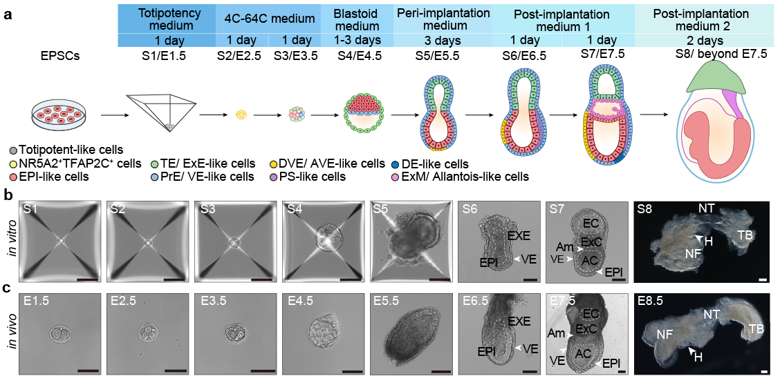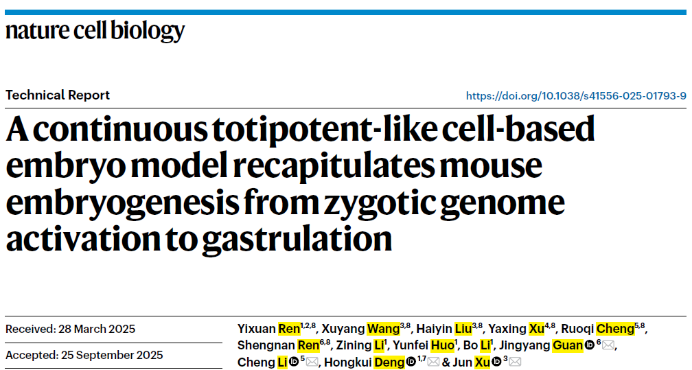 2025年10月15日,北京大学基础医学院徐君、邓宏魁;北京大学生命科学学院李程和北京大学药学院关景洋团队在Nature Cell Biology上发表了题为A continuous totipotent-like cell-based embryo model recapitulates mouse embryogenesis from zygotic genome activation to gastrulation的研究论文。该研究开发出一套新型的小鼠类全能干细胞诱导与维持体系,并基于此通过分阶段诱导的策略,成功构建了可在体外全程模拟小鼠胚胎期1.5天至7.5天(E1.5-E7.5)发育的类胚胎模型。在诱导体系的终点,模型展现出早期器官发生的迹象。