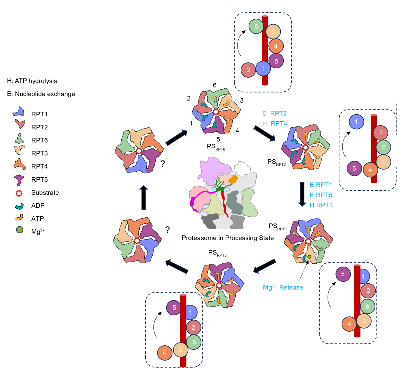 对于内源纯化的全长midnolin-26S蛋白酶体复合物,研究团队通过精细的三维分类,成功捕捉到四种连续的螺旋阶梯构象,如同一部“分子电影”逐帧展示了AAA+ ATP酶六聚体如何一步步将底物向下拉动。尤为重要的是,研究发现镁离子的释放与ATP水解之间存在潜在协同关系,二者共同驱动底物在降解通道中的移位(图2)。