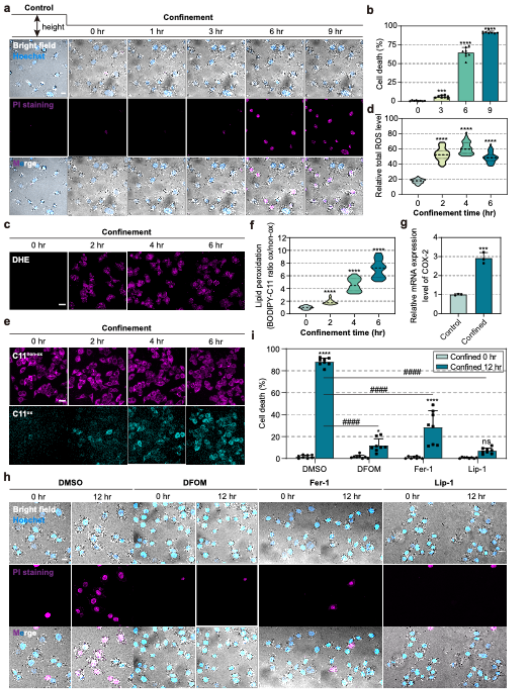 研究团队首先利用精密微加工技术,将细胞约束在仅3微米高的狭窄空间内,以模拟体内极端的拥挤环境。结果显示,细胞并未因挤压立即死亡,而是在几小时后“悄然崩溃”——这是一种受调控的死亡。通过系统性筛选,研究人员首先排除了因缺氧或营养匮乏导致死亡的可能性,并进一步排除了凋亡、坏死性凋亡、焦亡等已知细胞死亡途径。最终,多项证据共同指向了铁死亡—一种因脂质过氧化物异常累积而引发的程序性细胞死亡。在受限细胞中,脂质活性氧(ROS)水平显著上升,而使用多种铁死亡抑制剂则可有效阻止细胞死亡。