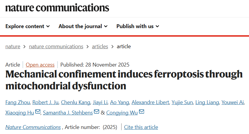 2025年11月28日,北京大学基础医学院吴聪颖团队、澳大利亚昆士兰大学Samantha J. Stehbens团队以及北京大学第三医院胡晓青团队在Nature Communications上合作发表研究Mechanical confinement induces ferroptosis through mitochondrial dysfunction,揭示了细胞核感知长期的物理挤压,进而诱导线粒体功能障碍,最终触发一种被称为“铁死亡”的程序性细胞死亡。这项发现明确了细胞核与线粒体作为核心枢纽,在机械应力转化为细胞死亡信号中发挥关键作用,并阐明了Drp1与cPLA2在其中的精密协作,为骨关节炎等压力相关疾病的治疗提供了新思路。