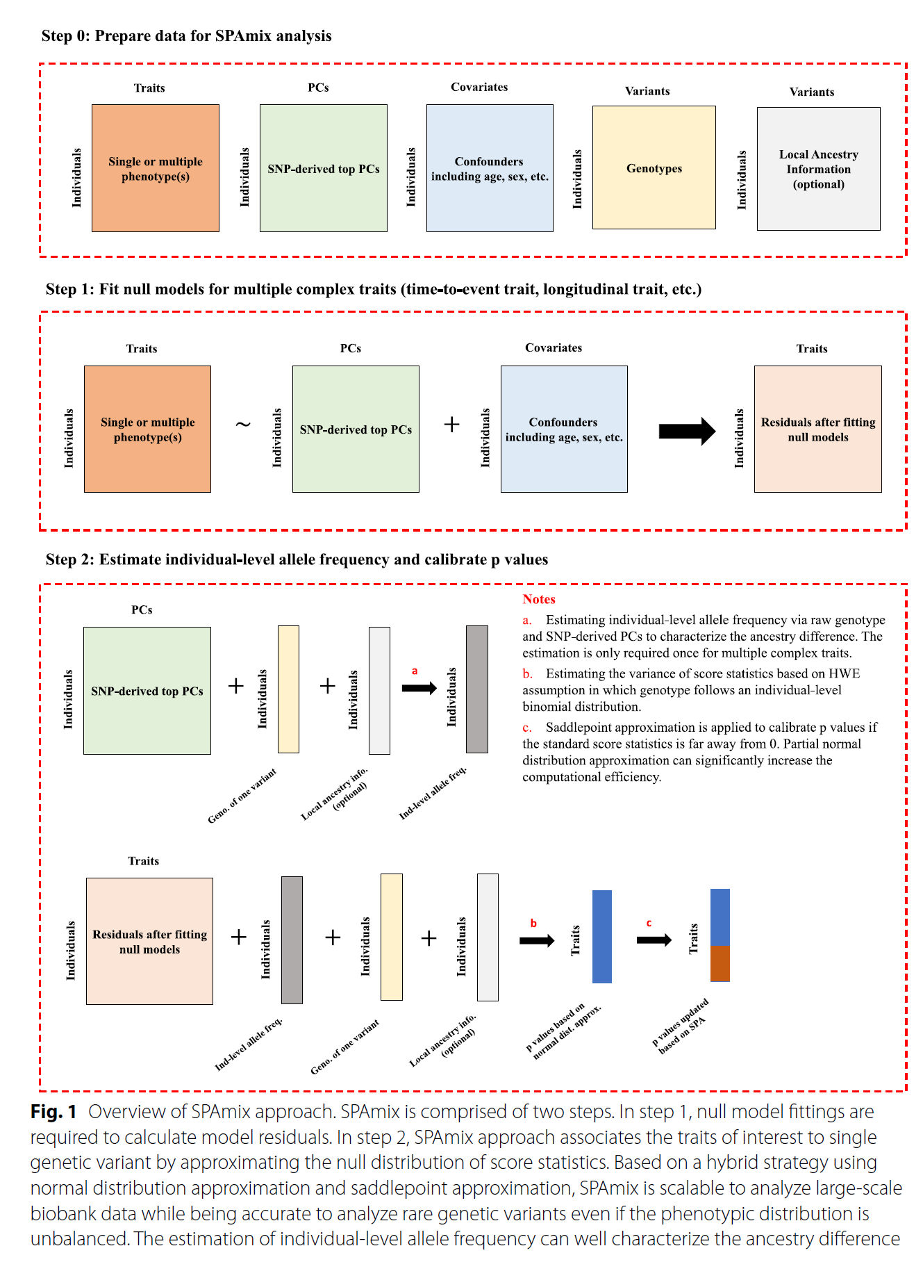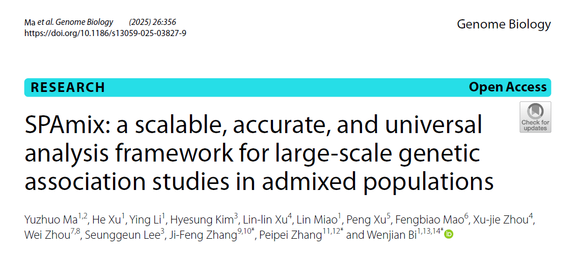 2025年10月16日,北京大学基础医学院的毕文健/张培培团队与中国科学院数学与系统科学研究院张纪峰团队合作,在Genome Biology期刊发表工作SPAmix: A scalable, accurate, and universal analysis framework for large-scale genetic association studies in admixed populations。该工作提出了一个针对复杂数据结构表型的通用GWAS分析框架SPAmix,并基于数值模拟以及UK Biobank和ALLofUS的实际数据分析验证了算法的有效性,在跨种族分析中找出了多个显著的具有显著遗传效应的位点。