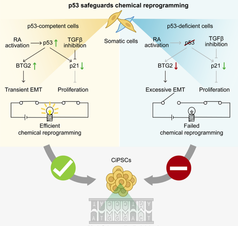 该研究实现了p53在肿瘤抑制与高效细胞重编程之间的平衡。在化学重编程过程中,p53作为质量控制因子,可有效清除重编程产物中p53缺陷及携带突变的细胞,从底层机制上确保了重编程来源的多能干细胞的安全性。