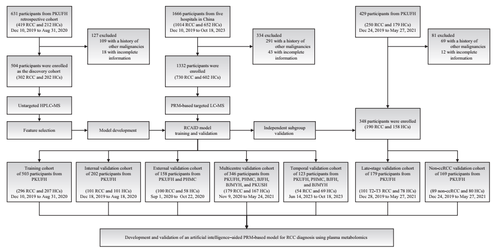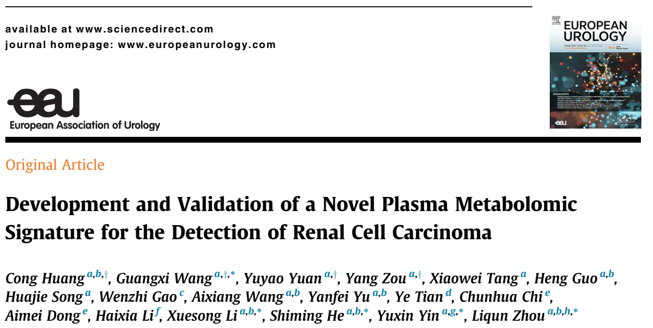 2025年10月4日,北京大学基础医学院尹玉新/王光熙团队与北京大学第一医院泌尿外科周利群/李学松/何世明团队合作,在国际医学领域期刊European Urology在线发表题为“Development and Validation of a Novel Plasma Metabolomic Signature for the Detection of Renal Cell Carcinoma”的研究论文。该研究应用人工智能(AI)与代谢组学、多组学联合分析技术,系统揭示了肾癌的代谢重编程特征,并开发出一套可用于肾癌检测的AI辅助血浆代谢诊断新方法。