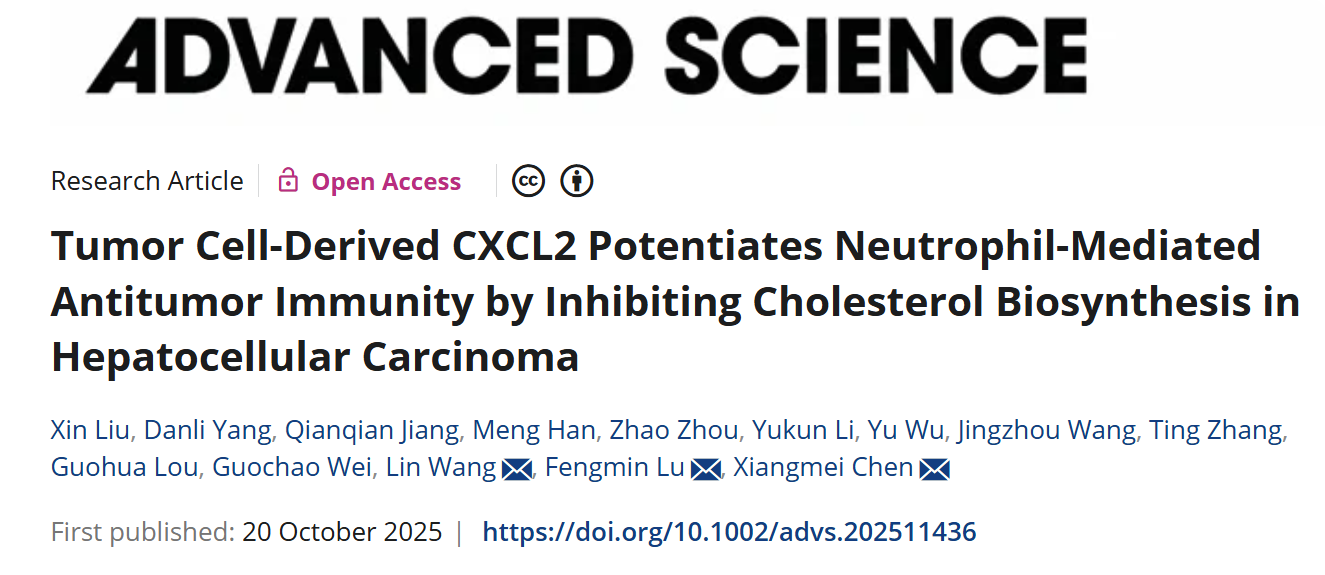 2025年10月20日,北京大学基础医学院、北京大学感染病研究中心鲁凤民/陈香梅/王麟研究团队在ADVANCED SCIENCE杂志在线发表题为“Tumor Cell-Derived CXCL2 Potentiates Neutrophil-Mediated Antitumor Immunity by Inhibiting Cholesterol Biosynthesis in Hepatocellular Carcinoma”的研究论文。不同于当前认为CXCL2主要作为趋化因子在细胞外发挥招募中性粒细胞功能的观点,该研究发现,肝癌细胞胞内分布的CXCL2可结合转录因子YBX1并抑制其核易位,后者降低了SREBF2的转录活性,抑制胆固醇生物合成,最终促进中性粒细胞的抗肿瘤作用,并可与PD-1单抗发挥协同抗HCC作用。