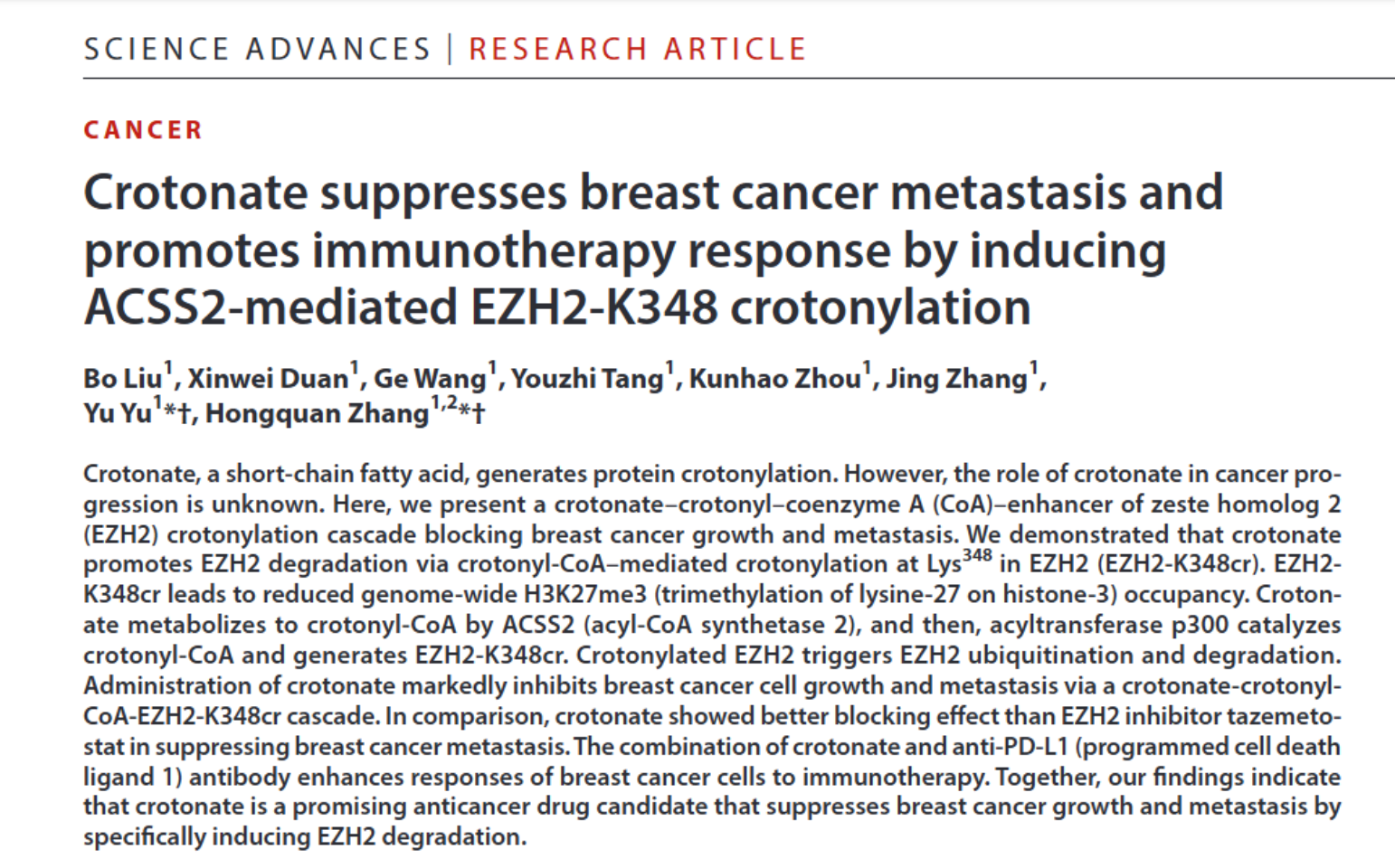 2026年1月16日,北京大学基础医学院、北京大学国际癌症研究院的张宏权教授领导的研究组在美国科学促进会旗下的综合期刊Science Advances 上在线发表了题为“Crotonate suppresses breast cancer metastasis and promotes immunotherapy response by inducing ACSS2-mediated EZH2-K348 crotonylation”的长篇研究论文,发现短链脂肪酸巴豆酸(crotonic acid或crotonate)通过ACSS2介导的致癌蛋白EZH2第348位赖氨酸(K348)的巴豆酰化修饰(crotonylation),导致EZH2的高效降解,从而抑制乳腺癌的生长和转移,同时巴豆酸也可以和肿瘤免疫检查点治疗协同,提高乳腺癌对免疫治疗的反应性。因此,代谢物巴豆酸和信号分子巴豆酰CoA展现出作为新型抗癌药物的潜力;同时这一研究也解决了靶向EZH2 治疗实体瘤临床上的一个难题。该发现提出了新的肿瘤治疗靶点,阐明了新的靶向机制,确立了阻断这一癌症演变过程的内源性代谢物及其衍生出的化合物,明确指出了巴豆酸和巴豆酰CoA的临床应用前景。