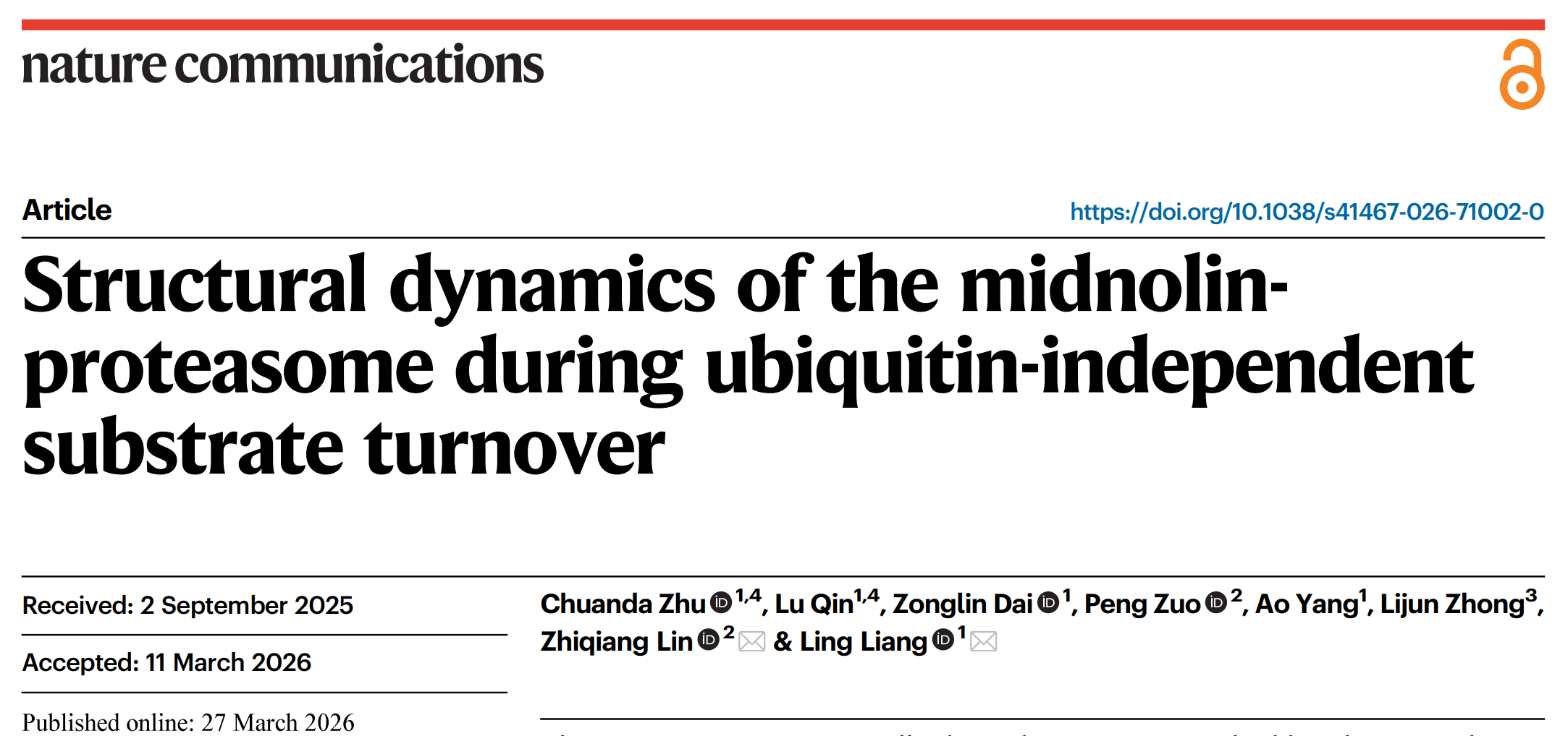 2026年3月27日,北京大学基础医学院梁令/林志强团队联合在Nature Communications杂志在线发表题为“Structural dynamics of the midnolin-proteasome during ubiquitin-independent substrate turnover”的研究论文。该研究通过冷冻电镜技术解析了midnolin-26S蛋白酶体复合物的多种构象状态,完整揭示了从底物识别、递送到降解的全流程动态机制,阐明了midnolin如何作为一种非经典的降解标签,以不同于泛素的方式将底物蛋白直接递送至蛋白酶体进行降解。这一发现为靶向“难成药”核蛋白的蛋白降解技术研发提供了新思路。