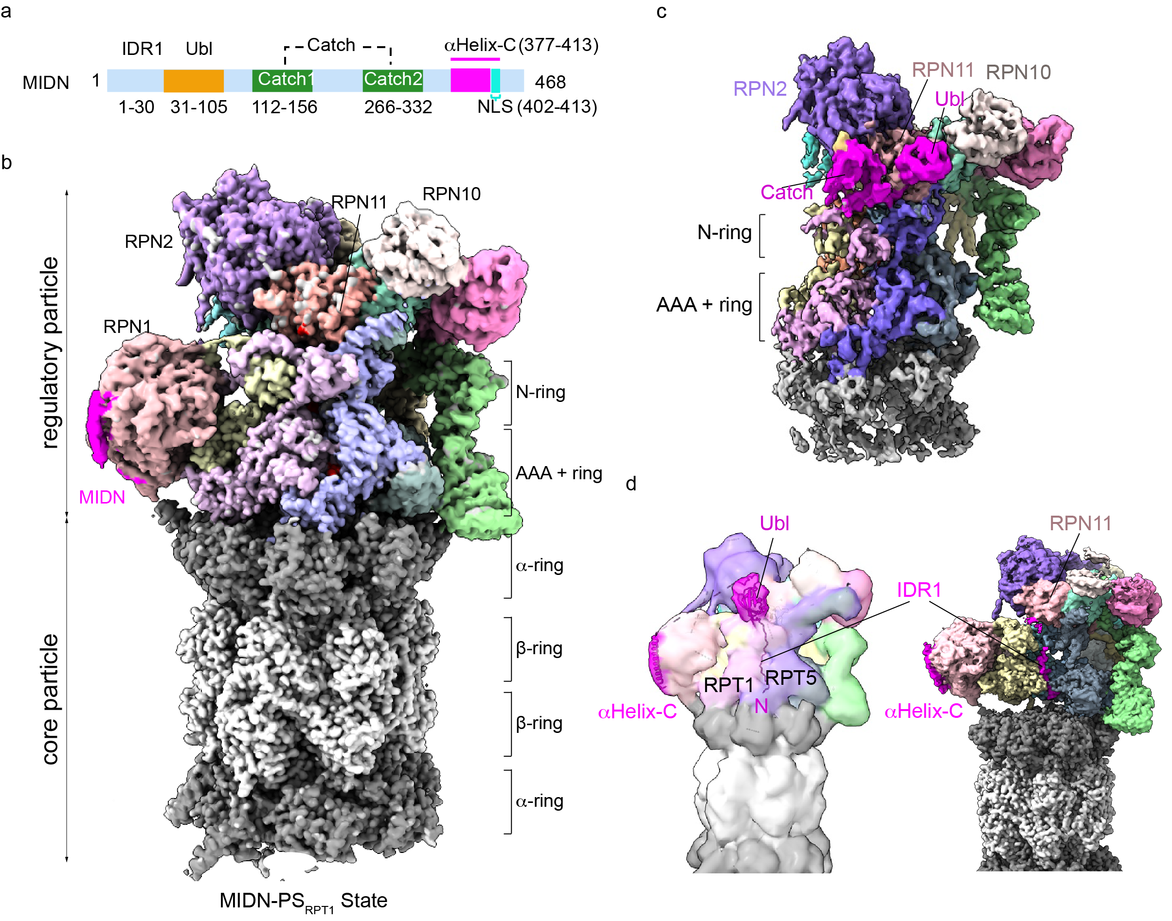 a. Midnolin(MIDN)结构示意图;b. Midnolin-蛋白酶体底物处理状态整体结构;c. Midnolin-EGR1-蛋白酶体复合物结构;d. Catch结构域缺失midnolin-蛋白酶体结构。