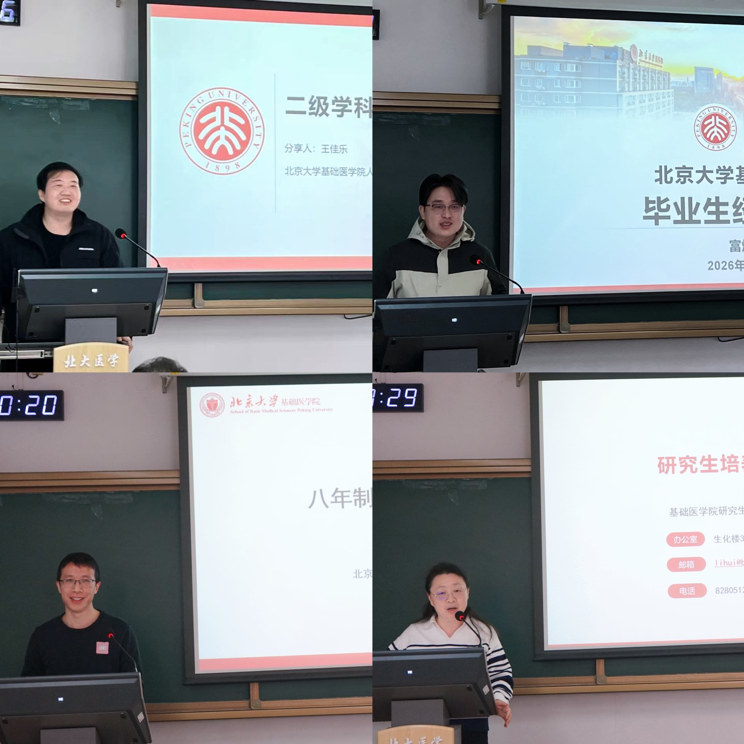 优秀八年制毕业生代表的分享则为学生们提供了未来学习、科研与发展的重要参考。基础医学院生理学与病理生理学系王佳乐结合自己博士后研究经历,强调科研中韧性比速度更重要,建议学生应从基础工作做起,广泛阅读文献、主动交流合作,平衡科研与生活;中国医学科学院阜外医院富烨楠详细介绍了实验室与导师选择的信息收集渠道、考察方法与评估因素,分享了多线推进课题、灵活调整研究思路的科研策略,同时给出了读博心态调整、压力应对及就业规划的实用建议;基础医学院医学生物信息学系叶川则以跨学科突破的经历,讲述了科研中积极求变的重要性,指导学生区分课题 “方法问题” 与 “方向错误”,理性平衡后选择坚持或放弃。