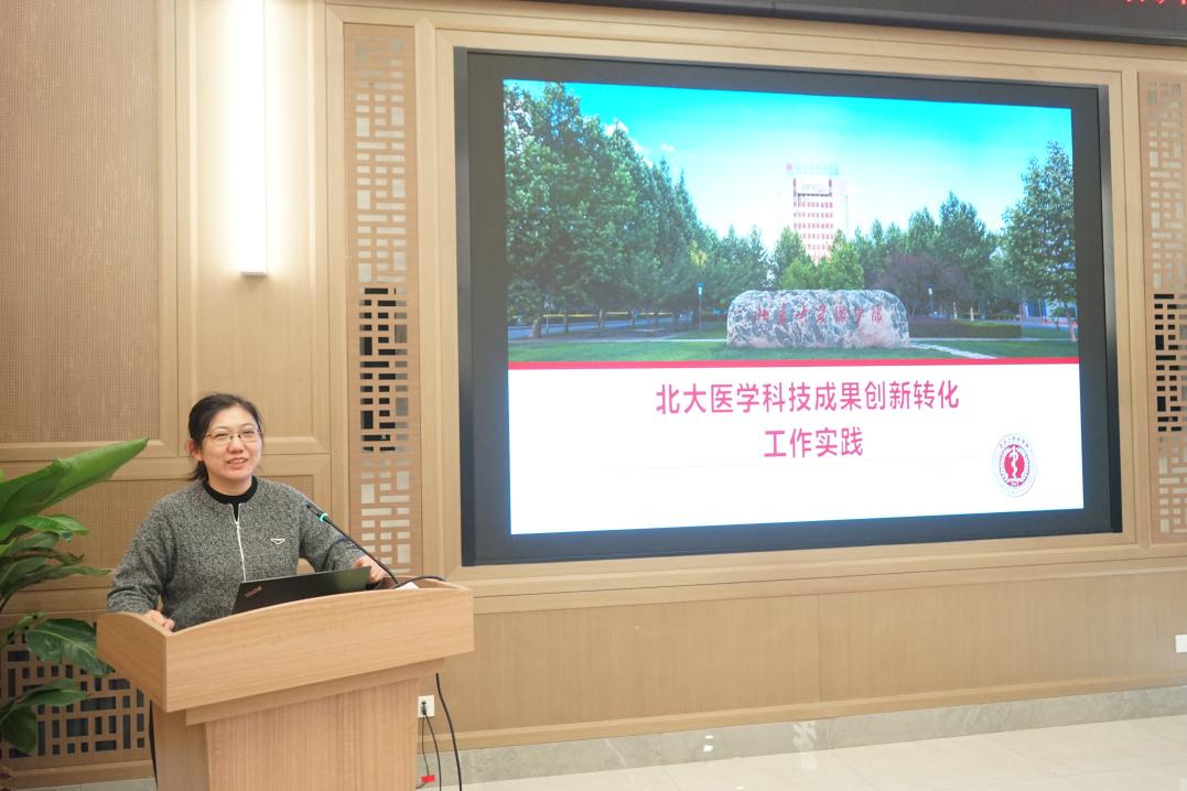 随后,医学部产业管理办公室副主任、技术转移办公室主任沈娟以《北大医学科技成果创新转化工作实践》为题,系统介绍了学校在成果转化方面的探索与成效。通过详实的数据图表,她清晰展示了北大医学在技术转让、横向科研、联合研发及知识产权等领域的发展态势,并重点解读了学校在技术转让制度保障与激励机制方面的创新举措。她表示,北大医学正持续构建完善的科技成果转化生态体系,未来将探索更多元的产学研合作模式。